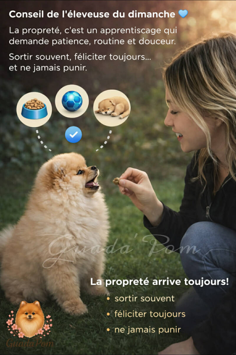 Commencez par des apprentissages simples : son nom, le rappel, la propreté, les premières règles de vie. Le Spitz nain apprend très bien avec une éducation positive, basée sur la récompenses et la constance.